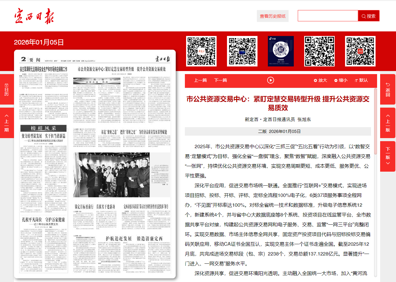 2025年,市公共资源交易中心以深化“三抓三促”“五比五看”行动为引领,以“数智交易·定慧模式”为目标,强化全省“一盘棋”理念,聚焦“数智”赋能,深度融入公共资源交易“一张网”,持续优化公共资源交易环境,实现交易周期更短、成本更低、服务更优、公平性更强。深化平台应用,促进交易市场统一联通。全面推行“互联网+”交易模式,实现进场项目招标、投标、开标、评标、定标全流程100%电子化,6类37项服务事项全程网办,“不见面”开标率达100%。对标全省统一技术和数据标准,升级电子信息系统12个,新建系统4个,并与省中心大数据底座等8个系统、投资项目在线监管平台、全市数据共享平台对接,构建起公共资源交易网和电子服务、交易、监管“一网三平台”完整闭环。实现交易数据、市场主体信息全网共享,固定资产投资项目代码与招标投标交易编码关联应用,移动CA证书全国互认,实现交易主体一个证书走遍全国。截至2025年12月底,共完成进场交易标段(包、宗)2238个,交易总额137.1228亿元。显著提升“一门进入、一网交易”服务水平。深化资源共享,促进交易环境阳光透明。主动融入全国统一大市场,加入“黄河流域高质量发展公共资源交易跨区域合作联盟”“易采虹”双随机城市联盟,与西安、乌鲁木齐、潍坊等19个城市签署远程异地评标合作协议,推动技术标准互认、信息资源共享。与大连市完成首个“双随机”+“双盲”跨区域远程异地评标项目。有序推进硬件设备迭代,配备远程评标视频终端、高清桌面摄像头、高音质耳麦、多因子评标互动终端、不见面评标管理机等硬件设备,建成席位制评标席位24个、远程异地评标机位60个,实现专家资源跨区域智能随机抽取、席位随机分配、评审实时交互、监督云端同步。截至2025年11月底完成远程异地评标项目193个,占比33%,涉及金额54.30亿元,共享使用省内外优质专家资源857人次,有效解决了本地专家资源不足以及“熟面孔”、“本地圈”问题。深化智慧监管,促进交易风险精准防范。持续完善智慧监督体系,完成电子交易系统170项需求优化、182项问题整改及114项数据修正。开通监管账户190个,设置异常行为“爆红”监测点67个,智能识别文件创建标识码雷同等违规行为7起,全部移交行业主管部门,实现问题线索“发现-研判-移交-反馈”的全链条闭环处置。同时,在评标准备环节强制嵌入招标文件评价与雷同性分析前置流程,确保技术比对成为评审必经步骤,有效降低了人工疏漏风险。创新打造“数字+线下”多维高效见证平台,对4类交易项目63个环节实行全过程数字见证,系统自动出具交易见证书2238份,依托见证监管大厅记录开评标现场4000余小时,对关键环节重点见证、重要事项即时预警。公开曝光代理机构23家次、评标专家3人次,配合行业主管、纪检监察、审计及公安等部门,提供档案调阅服务37次,涉及560个项目,构建起问题精准发现、信息及时共享、办理高效规范、处置联动有力的场内场外联动监管工作机制。深化点位服务,促进交易主体更加有感。持续强化数字赋能,上线AI客服“标慧通”,推行“AI+人工”双轨服务模式,实现开标环节AI自动唱标、土地矿产及产权交易“电子竞价LED实时直播”功能,提升系统操作便捷性。建立7×24小时“跟班服务+”机制,助力1086个项目交易提速,开标至中标结果公示平均时长由131小时压缩至100.8小时,各类公告办理平均时长由2.68小时缩短至0.7小时,整体时效稳居全省前列。全面停收投标保证金,电子保函平均费率降至1.93%,上线竞买保证金电子退还转付功能,136笔10.1378亿元竞买保证金线上转为出让金,退付时间缩短90%,显著降低企业制度性交易成本。加强源头管理,招标文件100%公平竞争审查。强化交易数据治理,注重各类交易信息有效公开,严格规范项目候选人公示内容,形成标准化公示文本,促进各类企业公平参与市场竞争,切实提升营商环境“软实力”。